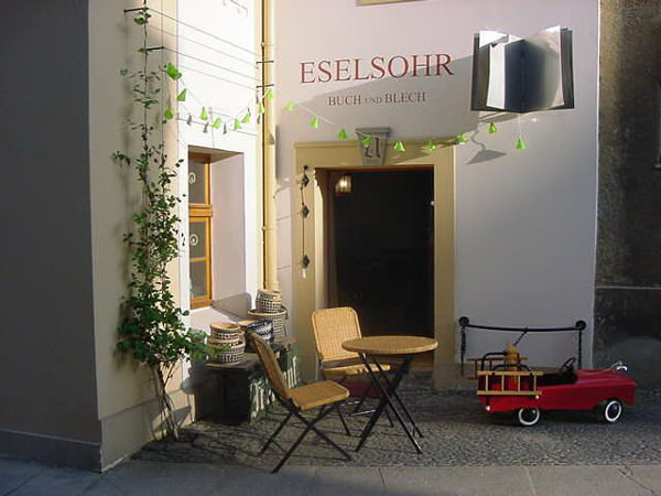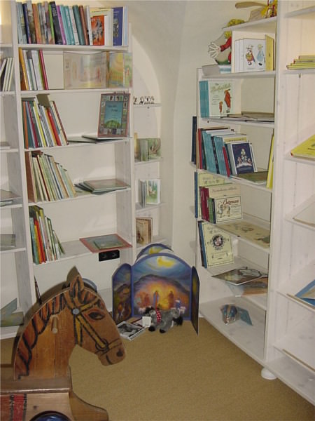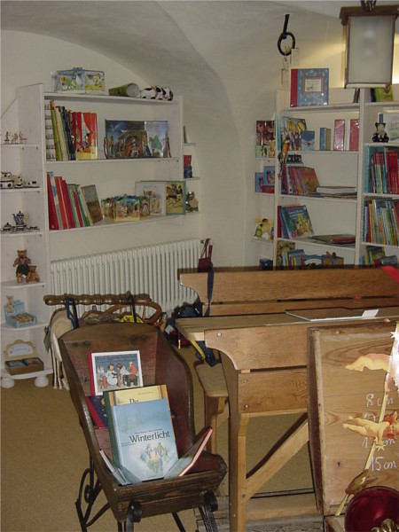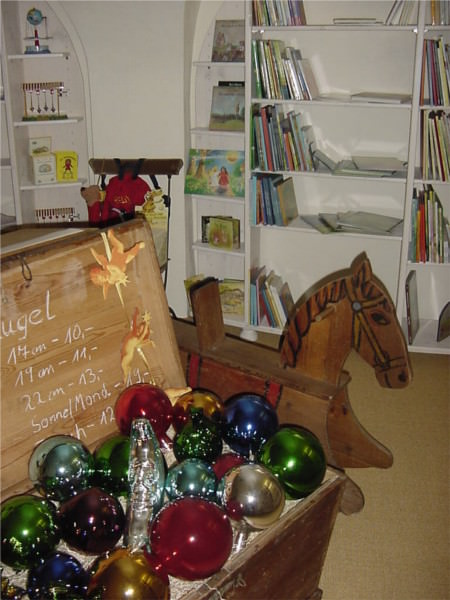 Unser kleiner Laden bietet Bücher für Kinder und Erwachsene, außerdem verkaufen wir Blechspielzeug.